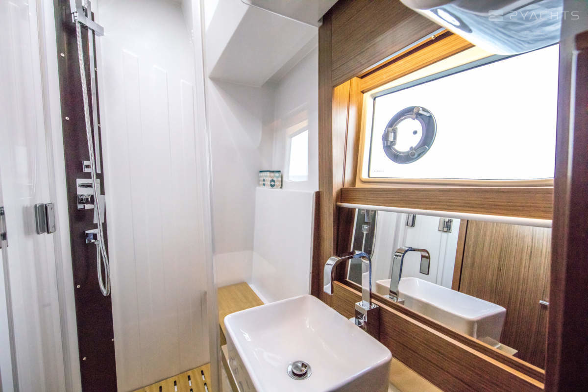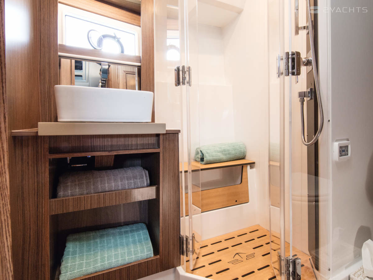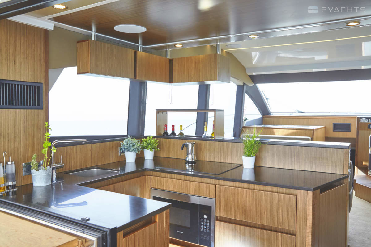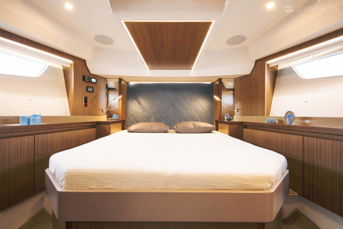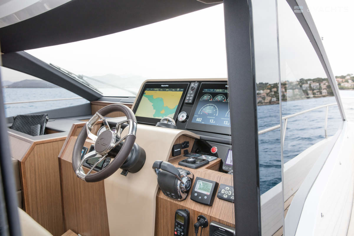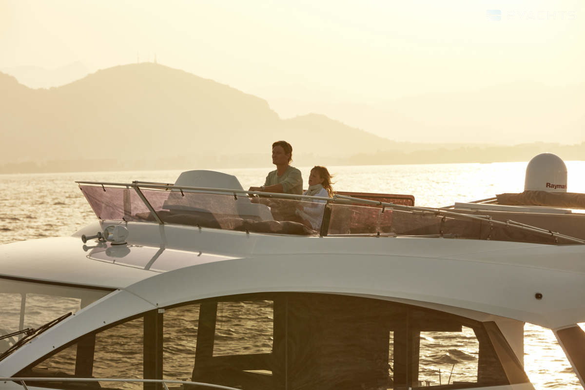 На флайбридже с биминитопом расположен дублирующий пост управления, обеденная зона из дивана и столика, малый камбуз-буфет с грилем, холодильником и мойкой, диваны-трансформеры. На основной палубе в носовой части расположена зона отдыха с лежаками и интегрированным между ними столиком для коктейлей. Сразу за ней закрытый салон с основным постом управления, сдвоенным шкиперским креслом, угловым диваном, обеденной зоной и камбузом. Кухня укомплектована разделочными поверхностями, раковиной, плитой, духовкой и СВЧ-печью. Из салона через сдвижные двери имеется выход на кокпит, где также установлен стол и угловой диван, образующие обеденную зону. С кокпита имеется выход на регулируемую по высоте купальную платформу с нескользящим покрытием.