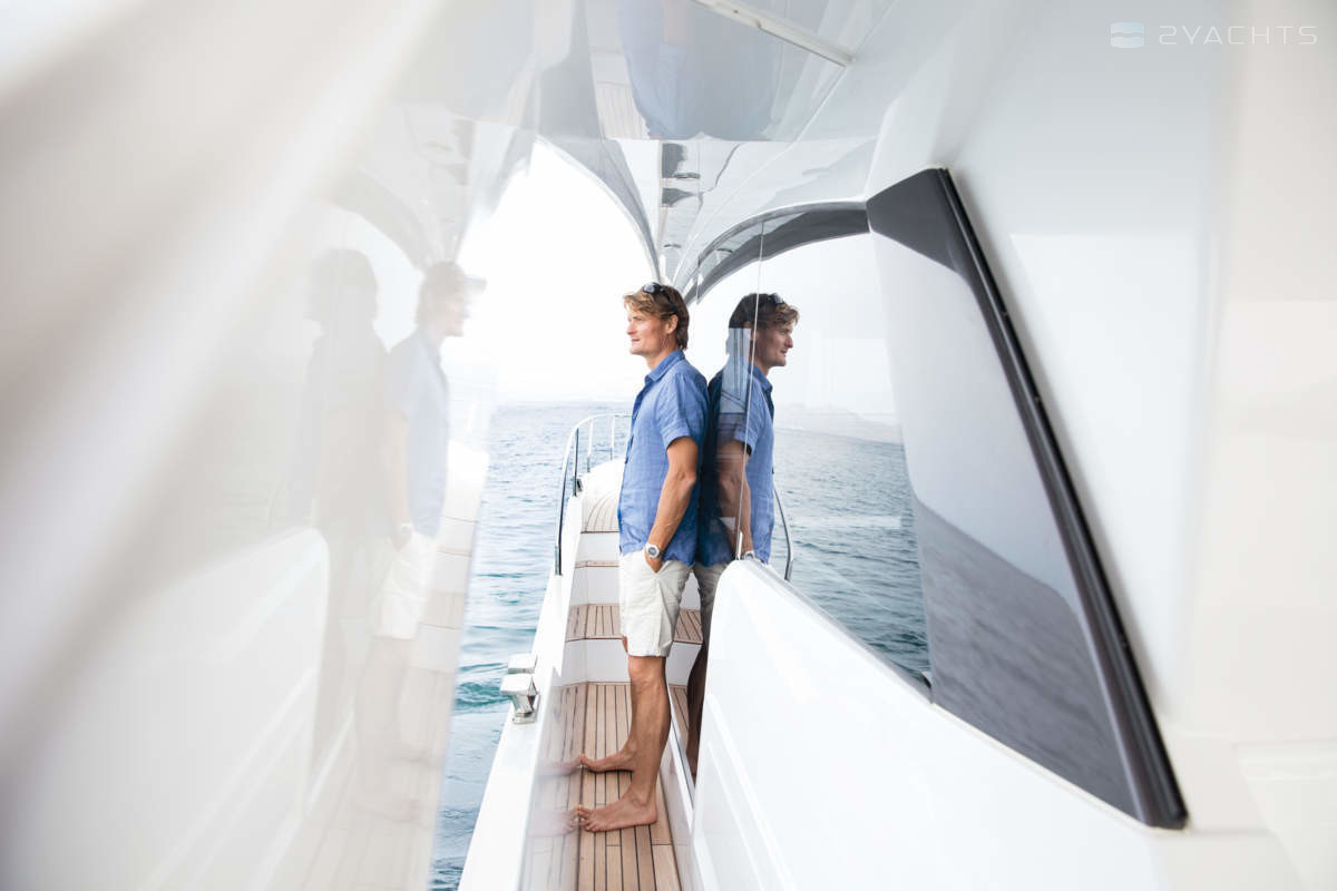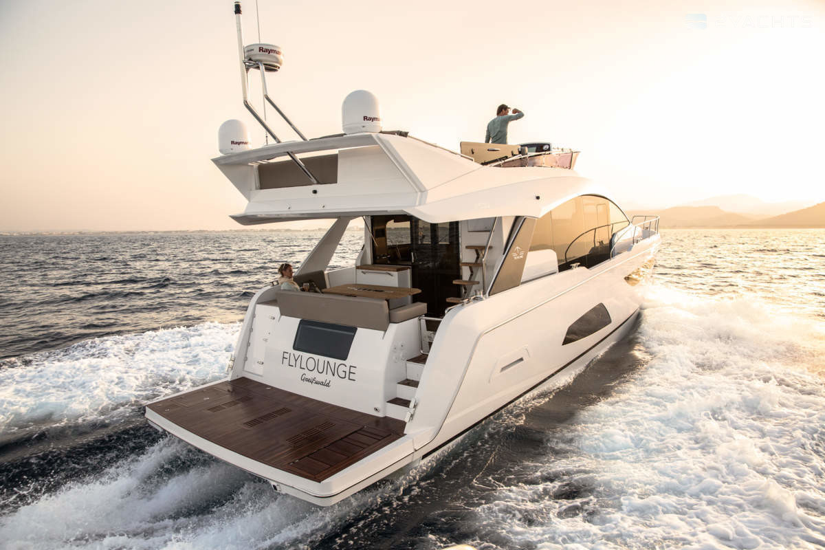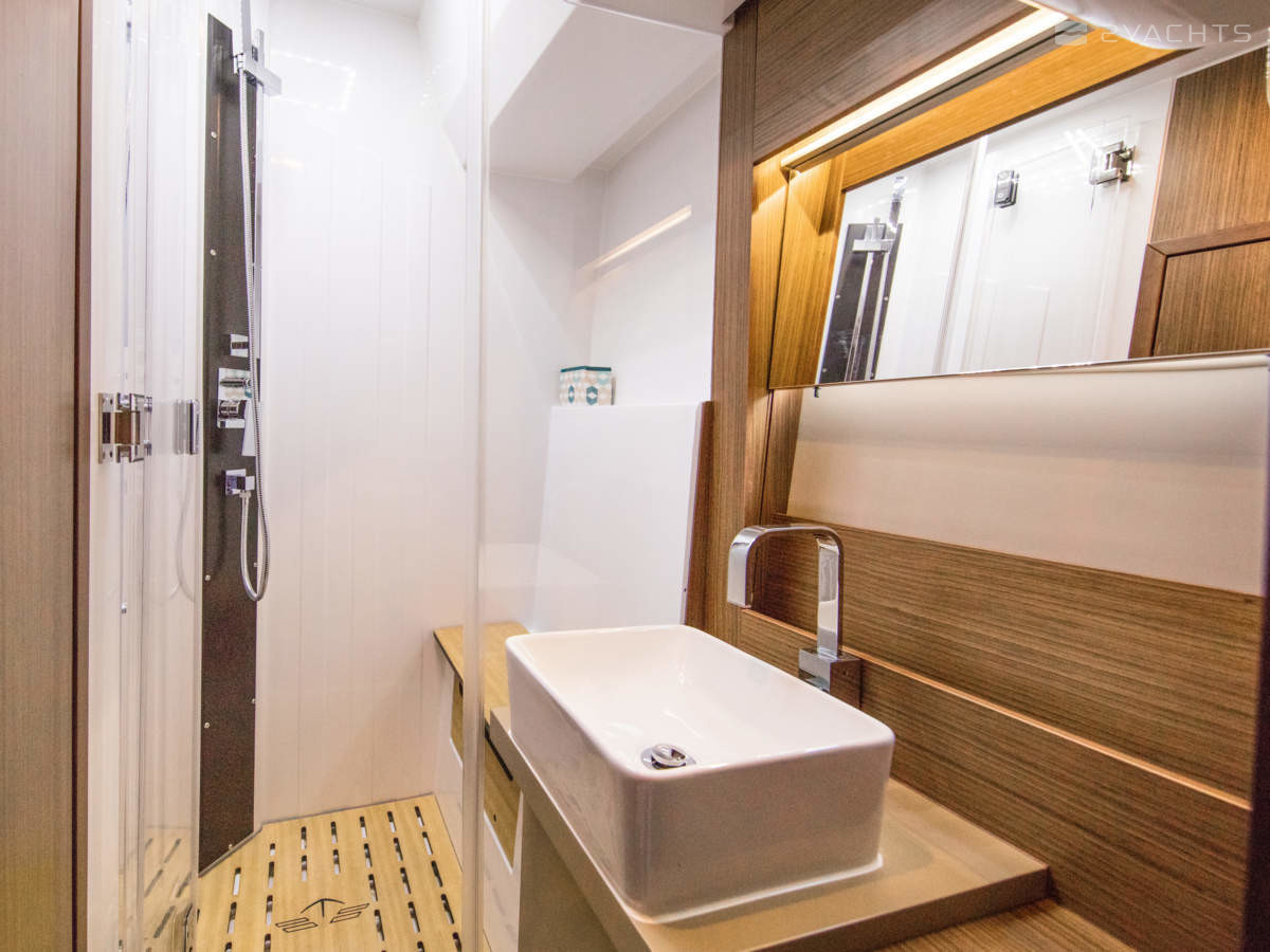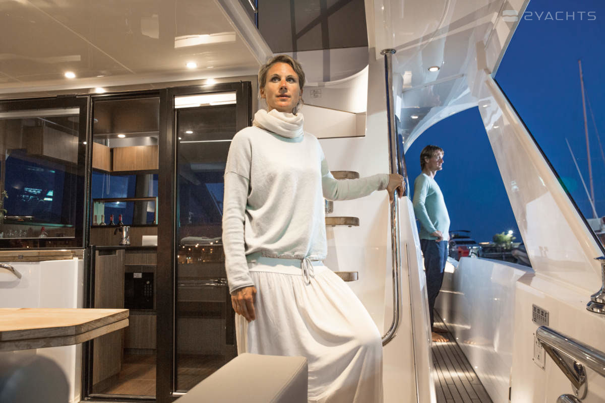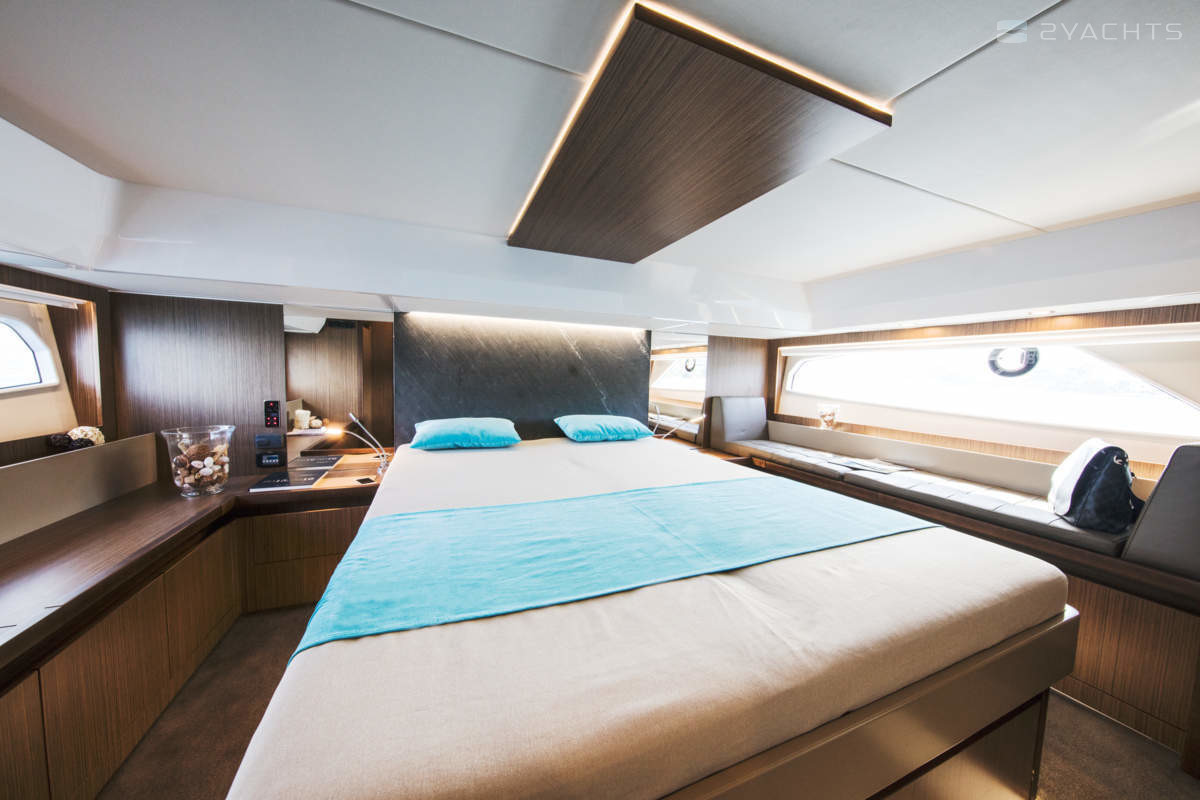 На флайбридже с биминитопом расположен дублирующий пост управления, обеденная зона из дивана и столика, малый камбуз-буфет с грилем, холодильником и мойкой, диваны-трансформеры. На основной палубе в носовой части расположена зона отдыха с лежаками и интегрированным между ними столиком для коктейлей. Сразу за ней закрытый салон с основным постом управления, сдвоенным шкиперским креслом, угловым диваном, обеденной зоной и камбузом. Кухня укомплектована разделочными поверхностями, раковиной, плитой, духовкой и СВЧ-печью. Из салона через сдвижные двери имеется выход на кокпит, где также установлен стол и угловой диван, образующие обеденную зону. С кокпита имеется выход на регулируемую по высоте купальную платформу с нескользящим покрытием.