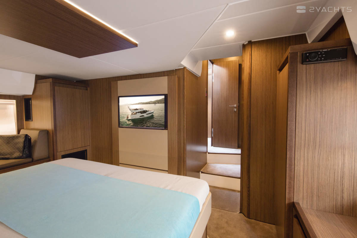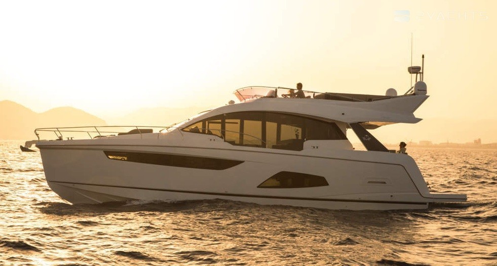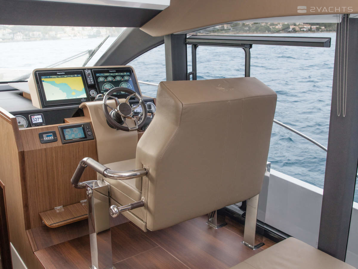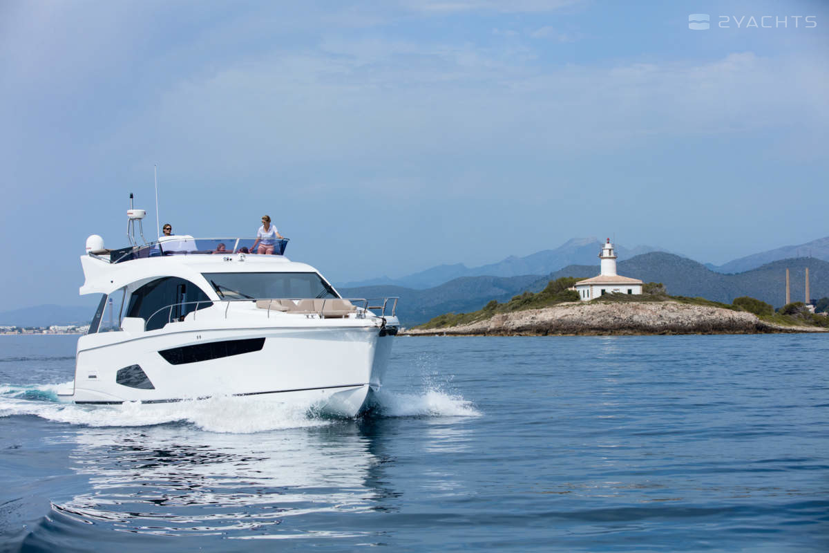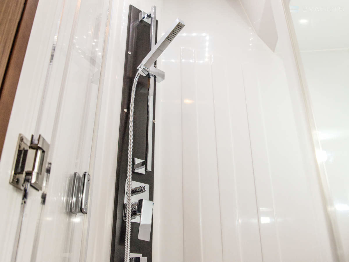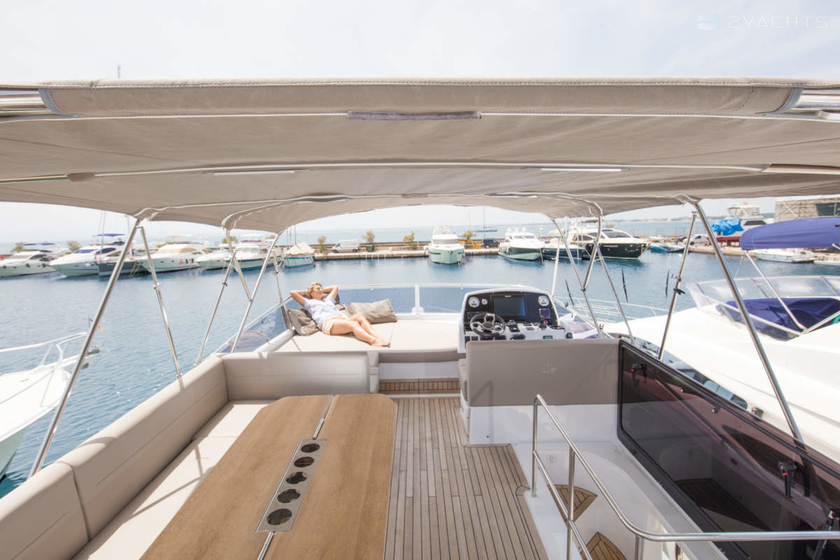 На флайбридже с биминитопом расположен дублирующий пост управления, обеденная зона из дивана и столика, малый камбуз-буфет с грилем, холодильником и мойкой, диваны-трансформеры. На основной палубе в носовой части расположена зона отдыха с лежаками и интегрированным между ними столиком для коктейлей. Сразу за ней закрытый салон с основным постом управления, сдвоенным шкиперским креслом, угловым диваном, обеденной зоной и камбузом. Кухня укомплектована разделочными поверхностями, раковиной, плитой, духовкой и СВЧ-печью. Из салона через сдвижные двери имеется выход на кокпит, где также установлен стол и угловой диван, образующие обеденную зону. С кокпита имеется выход на регулируемую по высоте купальную платформу с нескользящим покрытием.