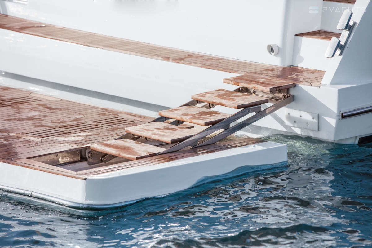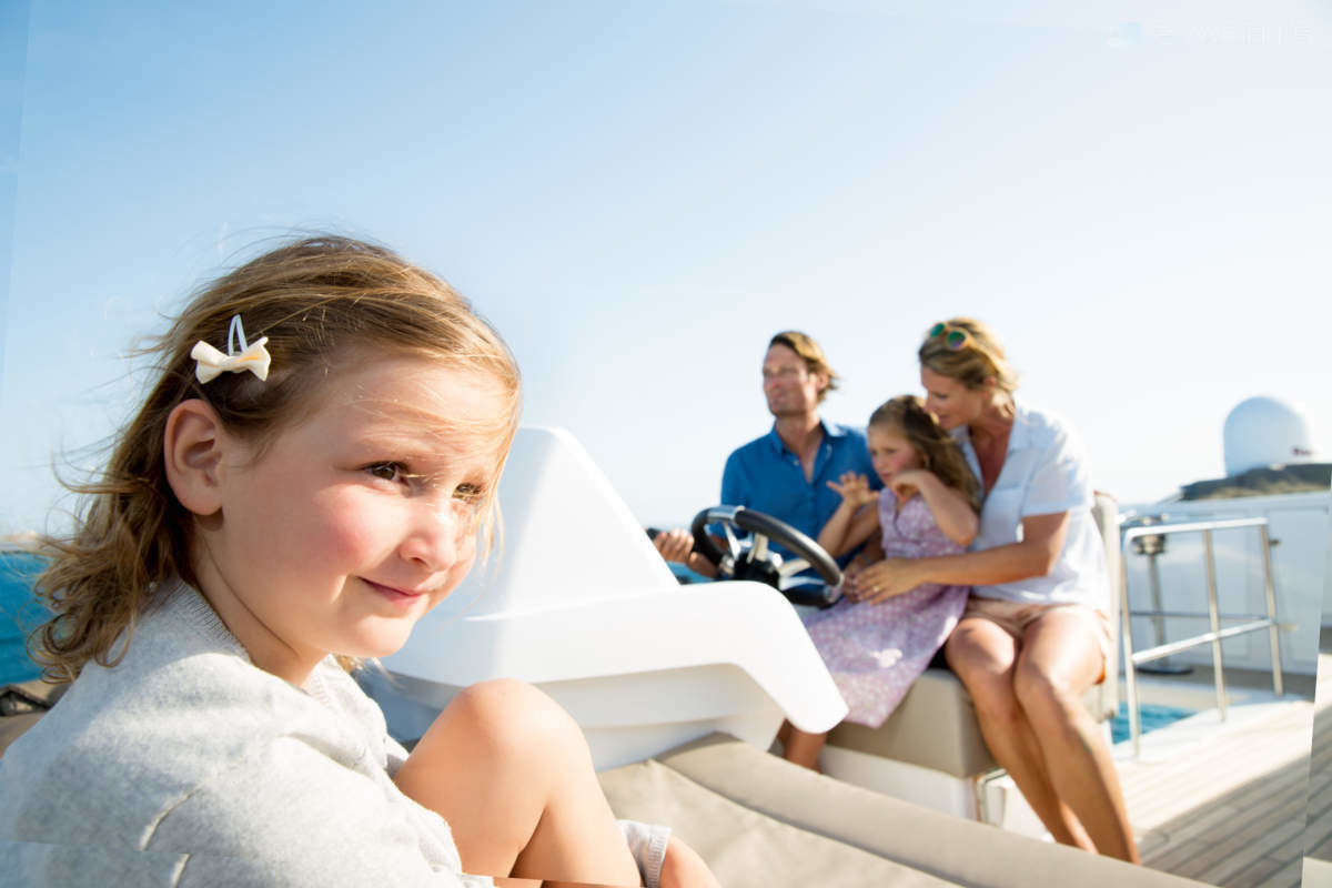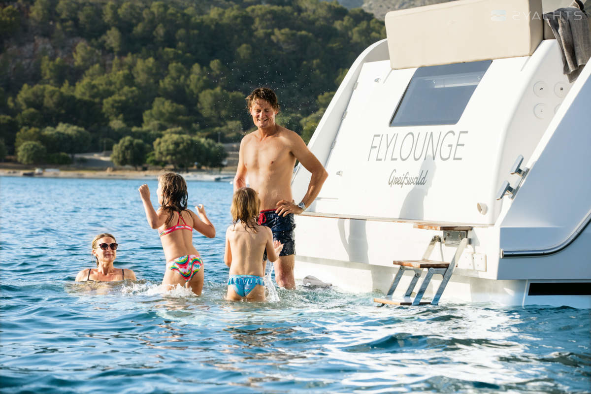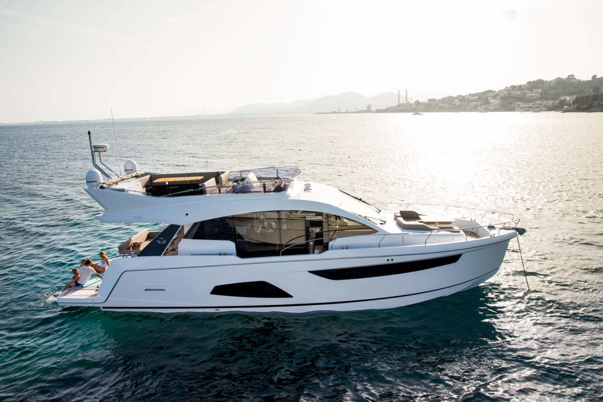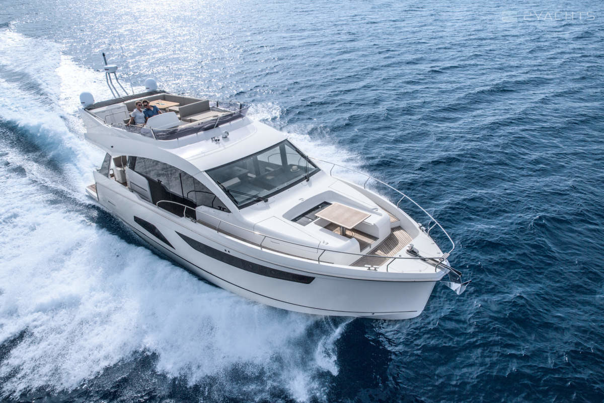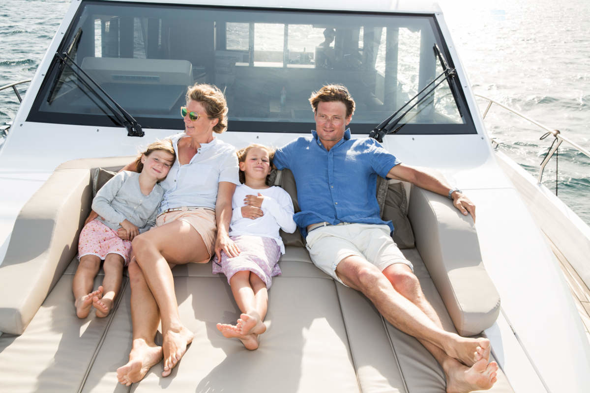На флайбридже с биминитопом расположен дублирующий пост управления, обеденная зона из дивана и столика, малый камбуз-буфет с грилем, холодильником и мойкой, диваны-трансформеры. На основной палубе в носовой части расположена зона отдыха с лежаками и интегрированным между ними столиком для коктейлей. Сразу за ней закрытый салон с основным постом управления, сдвоенным шкиперским креслом, угловым диваном, обеденной зоной и камбузом. Кухня укомплектована разделочными поверхностями, раковиной, плитой, духовкой и СВЧ-печью. Из салона через сдвижные двери имеется выход на кокпит, где также установлен стол и угловой диван, образующие обеденную зону. С кокпита имеется выход на регулируемую по высоте купальную платформу с нескользящим покрытием.