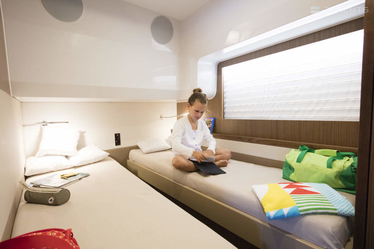 На нижней палубе расположены три двухместные каюты с санузлами, душевыми кабинками, туалетными столиками и шкафами для хранения одежды.