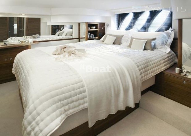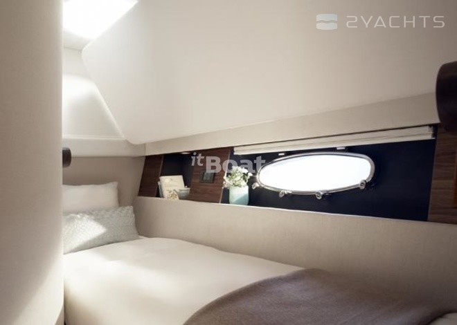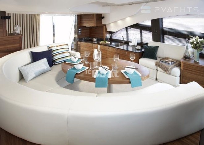 Отличительной особенностью дизайна яхты Sealine T50 являются пять наклонных иллюминаторов в бортах — два справа и три слева. Левые иллюминаторы украшают мастер-каюту, занимающую всю ширину корпуса в центральной части нижней палубы. Всего на нижней палубе три каюты. Полезное пространство в жилых помещениях увеличено благодаря разноуровневому полу роскошного салона T50. Яхта оборудована Sealine Extending Cockpit System. Эта система позволяет на стоянке при помощи сервопривода сдвинуть диван вместе с транцем назад, и таким образом на целый метр увеличить размер кокпита. Если же хочется искупаться, то нажатием кнопки все возвращается обратно, освобождая купальную платформу. Но главное в Sealine T50, конечно, инновационный запатентованный корпус, разработанный в сотрудничестве с признанным авторитетом в мире скоростных судов Оке Маннерфельтом (Ocke Mannerfelt). Идеальные обводы позволяют достичь великолепных результатов. Два двигателя Volvo D9 по 575 сил через компактный и эффективный привод с Z-образным редуктором и валами вращают 5-лопастные винты, которые на максимальных оборотах мотора разгоняют 20-тонную яхту до 32 узлов.