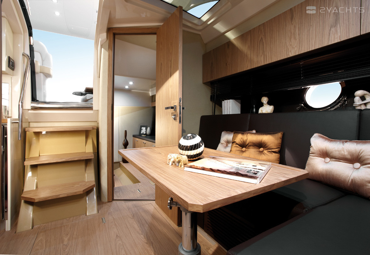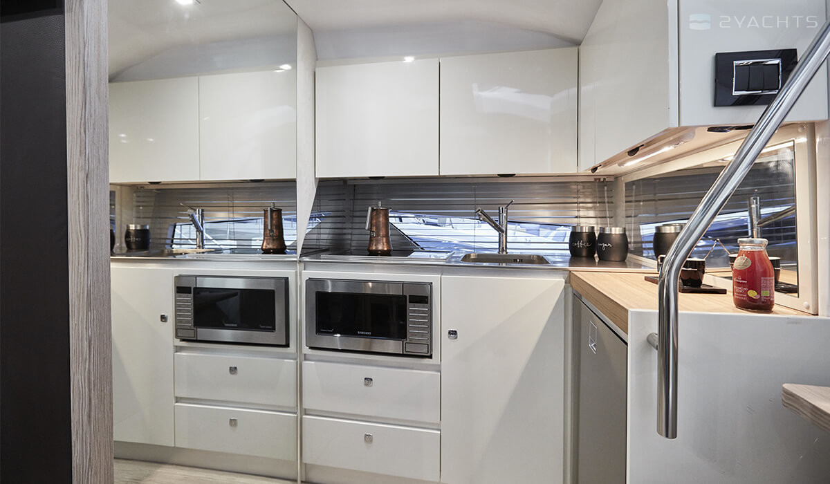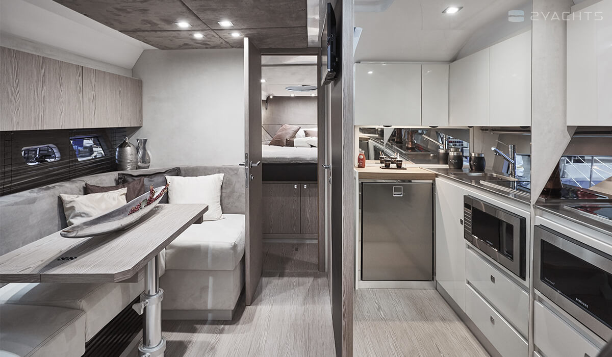 Работая над экстерьерами и интерьерами, они применили ценные породы дерева, кожу и нержавеющую сталь. Яхта получила панорамное остекление кокпита и бортов. Производитель предлагает различные варианты отделки и окраски корпуса на выбор заказчика.