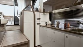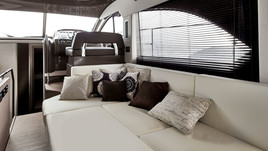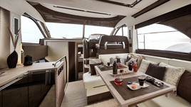 Салон Sessa Fly 42 с диванами и столом, образующими обеденную зону находится на главной палубе, здесь же основной пост управления и камбуз с плитой, СВЧ-печью и мойкой. Через сдвижные стеклянные двери из салона выход на транец с установленным здесь диваном и раскладывающимся столом. На корме купальная платформа.