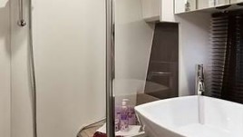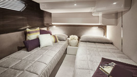 На нижней палубе находятся две каюты с санузлами и вещевыми шкафами. Мастер-каюта в носовой части оборудована двуспальной кроватью, а гостевая каюта на миделе имеет две односпальные кровати.