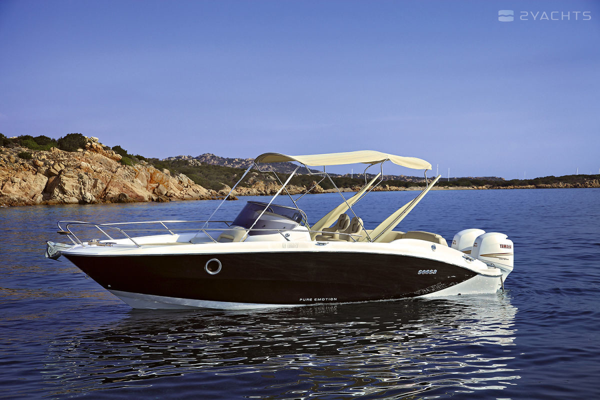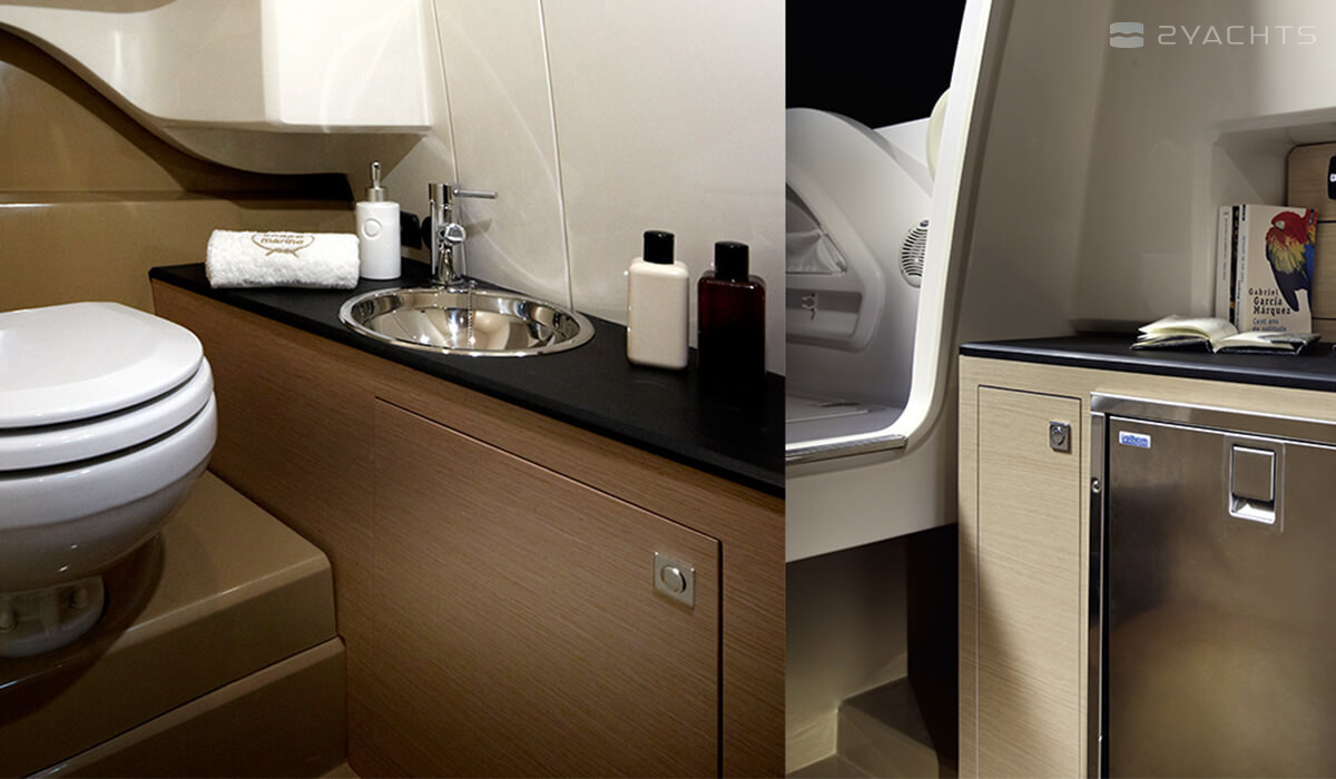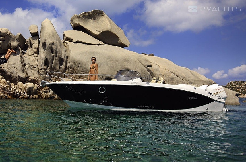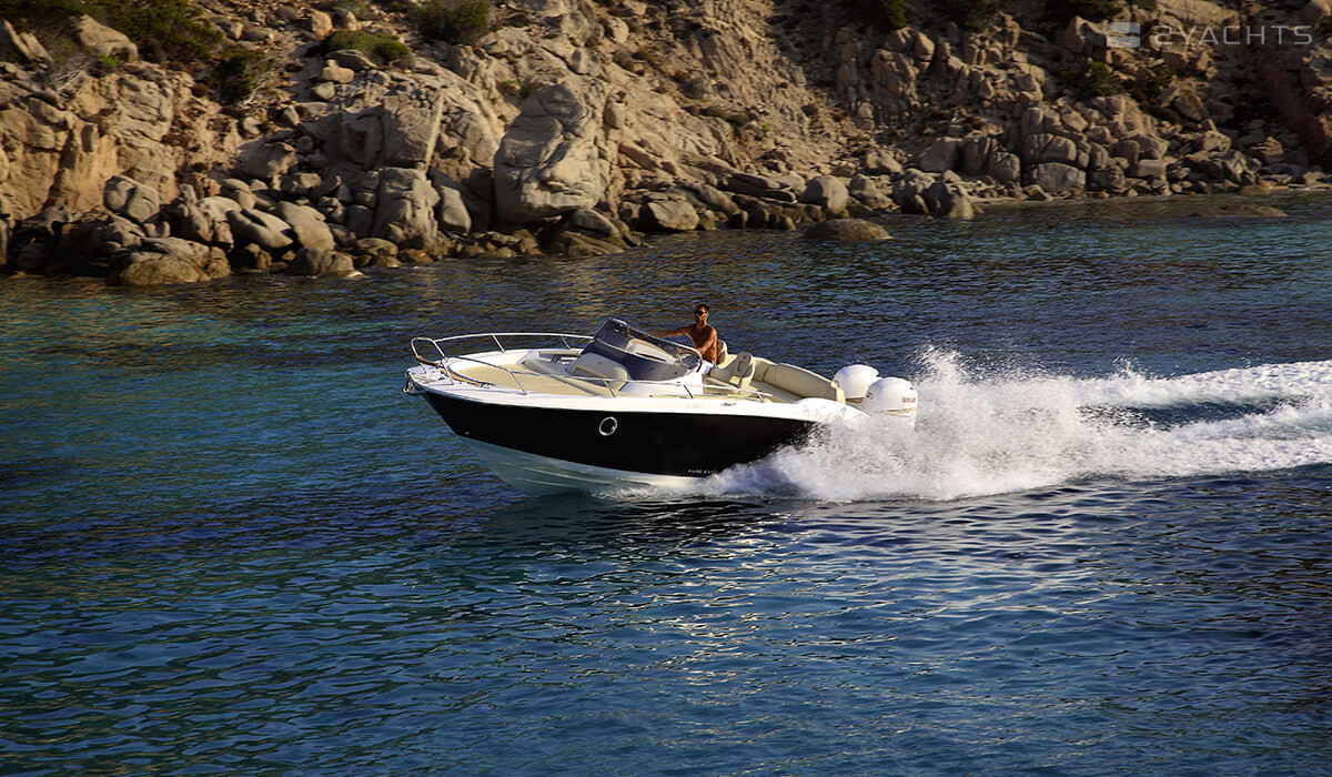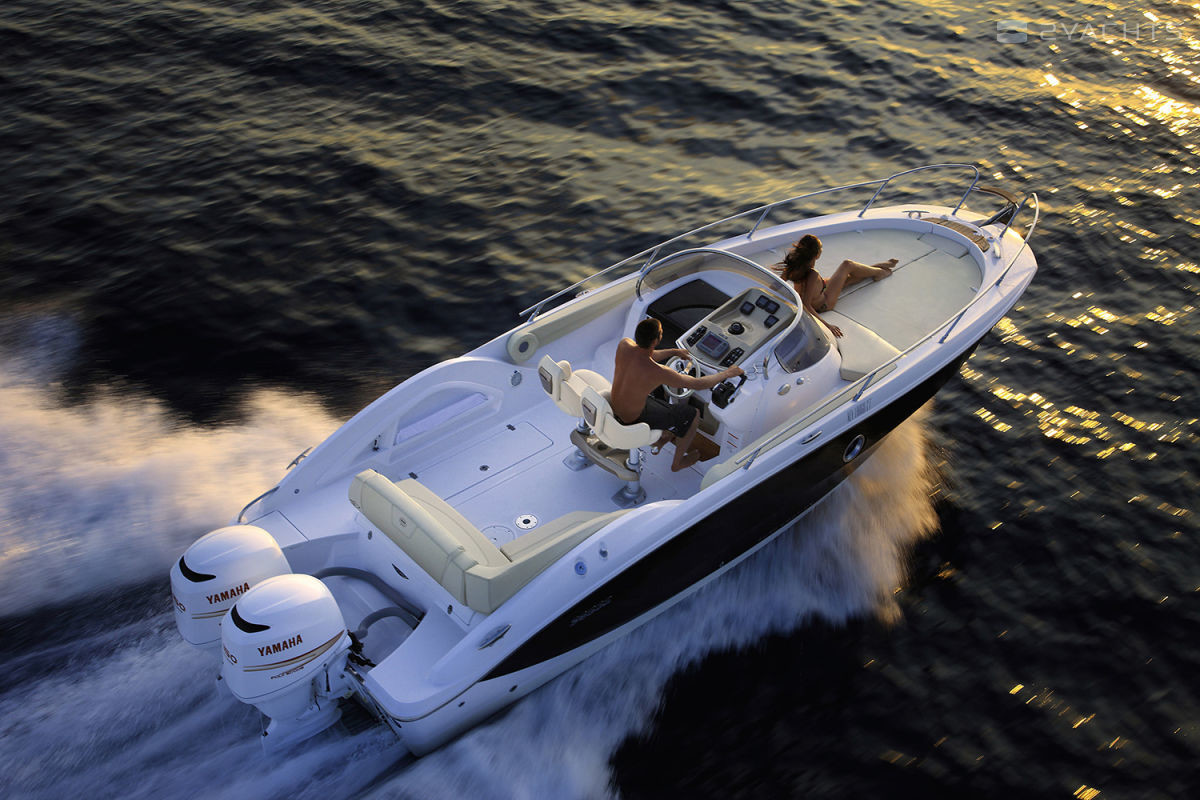 На палубе в носовой части находится зона отдыха с лежаками. Сразу за ней пост управления с двумя поворачивающимися креслами и угловой диван перед транцем. Здесь может быть установлен телескопический столик для создания коктейльной зоны.