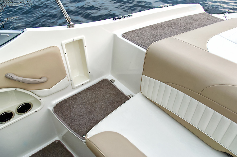 На транце расположен широкий диван, под которым есть выдвижной ящик для вещей или спортивного инвентаря. Поручни из нержавеющей стали обеспечивают безопасность пассажиров во время движения.