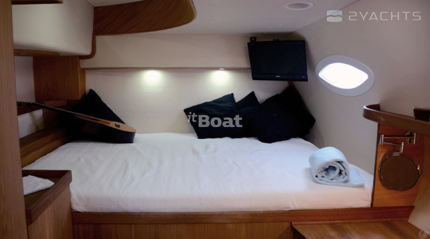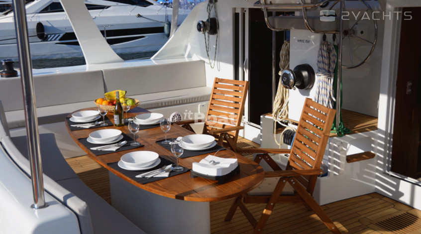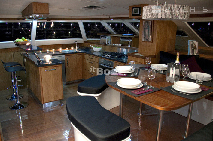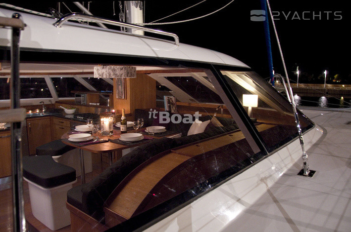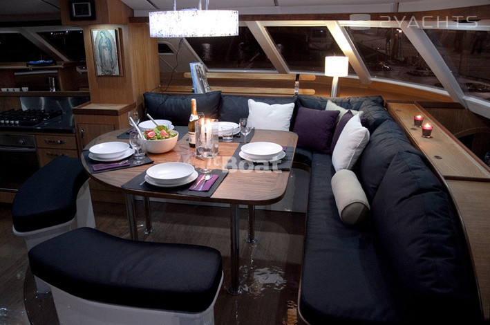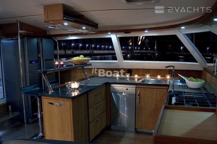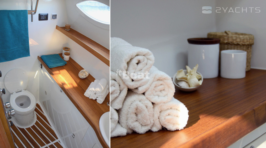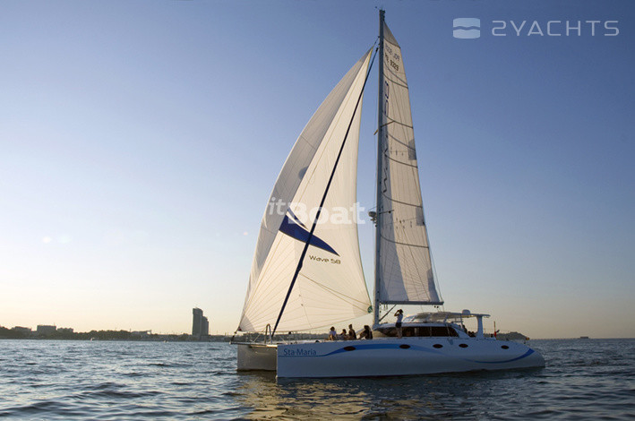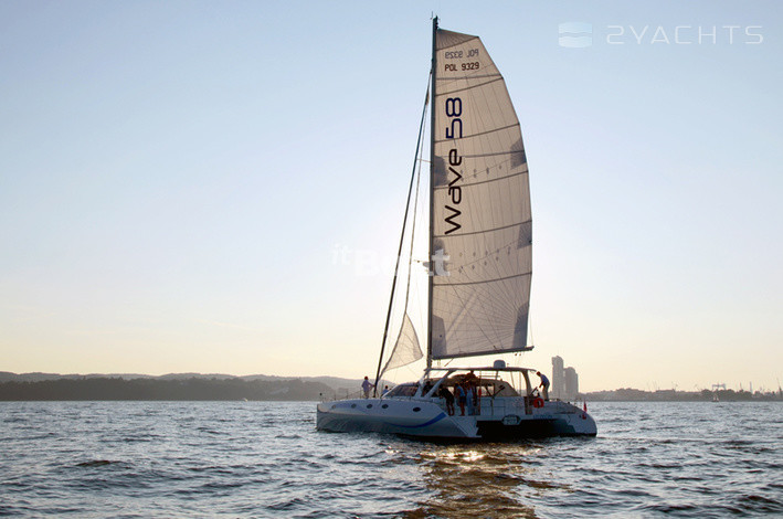 Катамаран Wave 58 — это довольно дорогое судно, позиционирующееся его создателями даже чуточку выше, чем дорогие французские катамараны серии Privilege и имеющее не часто встречающуюся на таких судах планировку с расположением двух кают поперечно в носовой части моста. При такой схеме в корпусах становится свободнее (одна из корпусных кают «переезжает» в мост), как следствие, весь правый корпус здесь целиком отдан под апартаменты владельца: помимо каюты и довольно просторного гальюна в носовой части корпуса расположен небольшой кабинет. Его можно использовать под офис или мастерскую — по желанию владельца. Впрочем, это лишь одна из возможных схем планировки такого судна, поскольку почти 60-футовый размер дает конструкторам широкую свободу в выборе компоновочных схем (в частности, один из вариантов предусматривает обустройство камбуза… в корме левого корпуса. Зато внутренний салон получается просто огромным). Некоторая необычность архитектуры катамарана (его корпуса в вертикальном сечении имеют эллиптическую форму с сужением к верхней палубе), ассоциирующаяся со скоростными рекордными парусными многокорпусниками, резко выделяет Wave 58 из ряда похожих на него катамаранов.