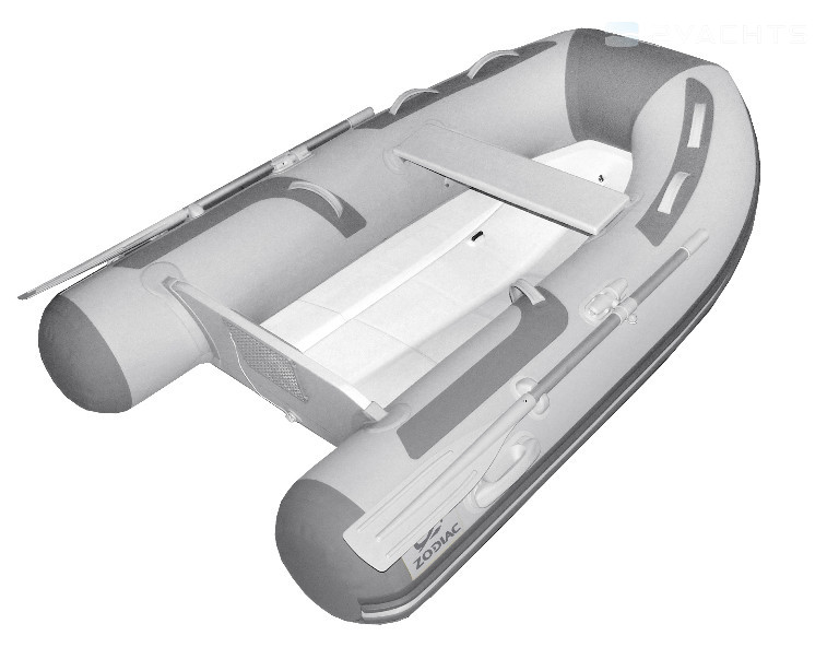 На катер устанавливается пластиковая скамья для нескольких человек, под которой предусмотрено пространство для личных вещей. Пол оборудован противоскользящими насечками и несколькими клапанами для слива воды. Возле скамьи и на носовой части модели, по ее бортам, установлены крепления для безопасности пассажиров, а рядом с ними расположены ручки для транспортировки. Корма Zodiac COMPACT 250 оборудована двумя креплениями для буксировки. Корпус и комплектующие судна имеют серо-синюю окраску.
